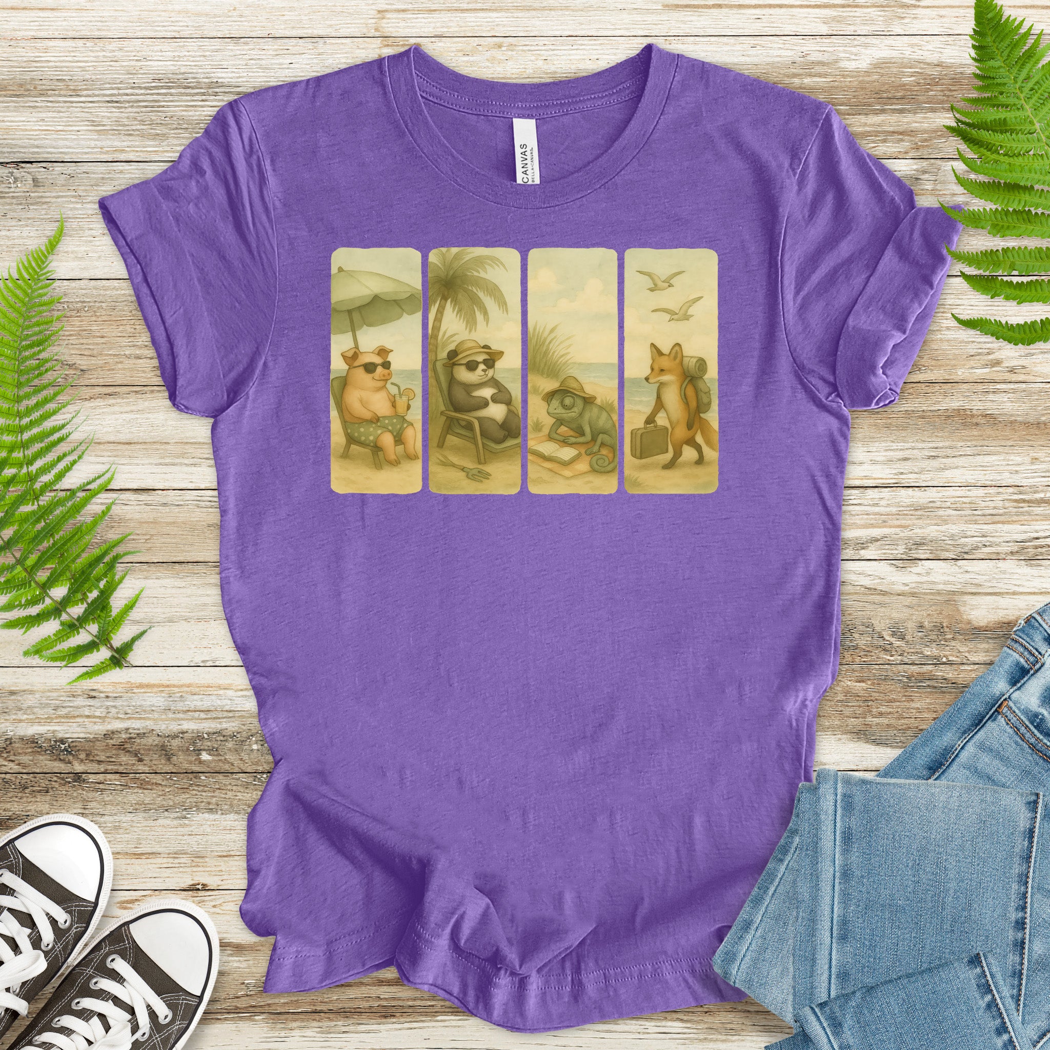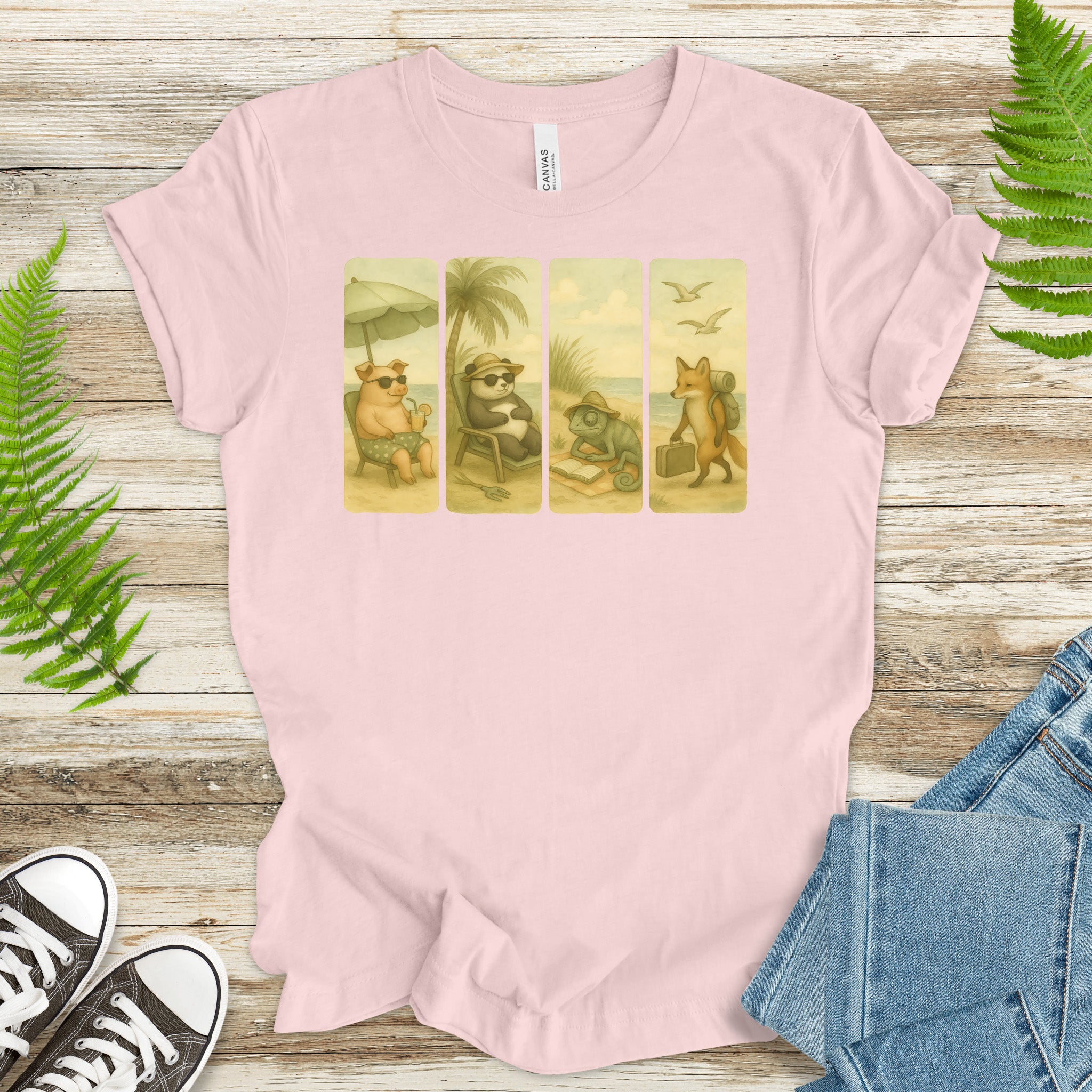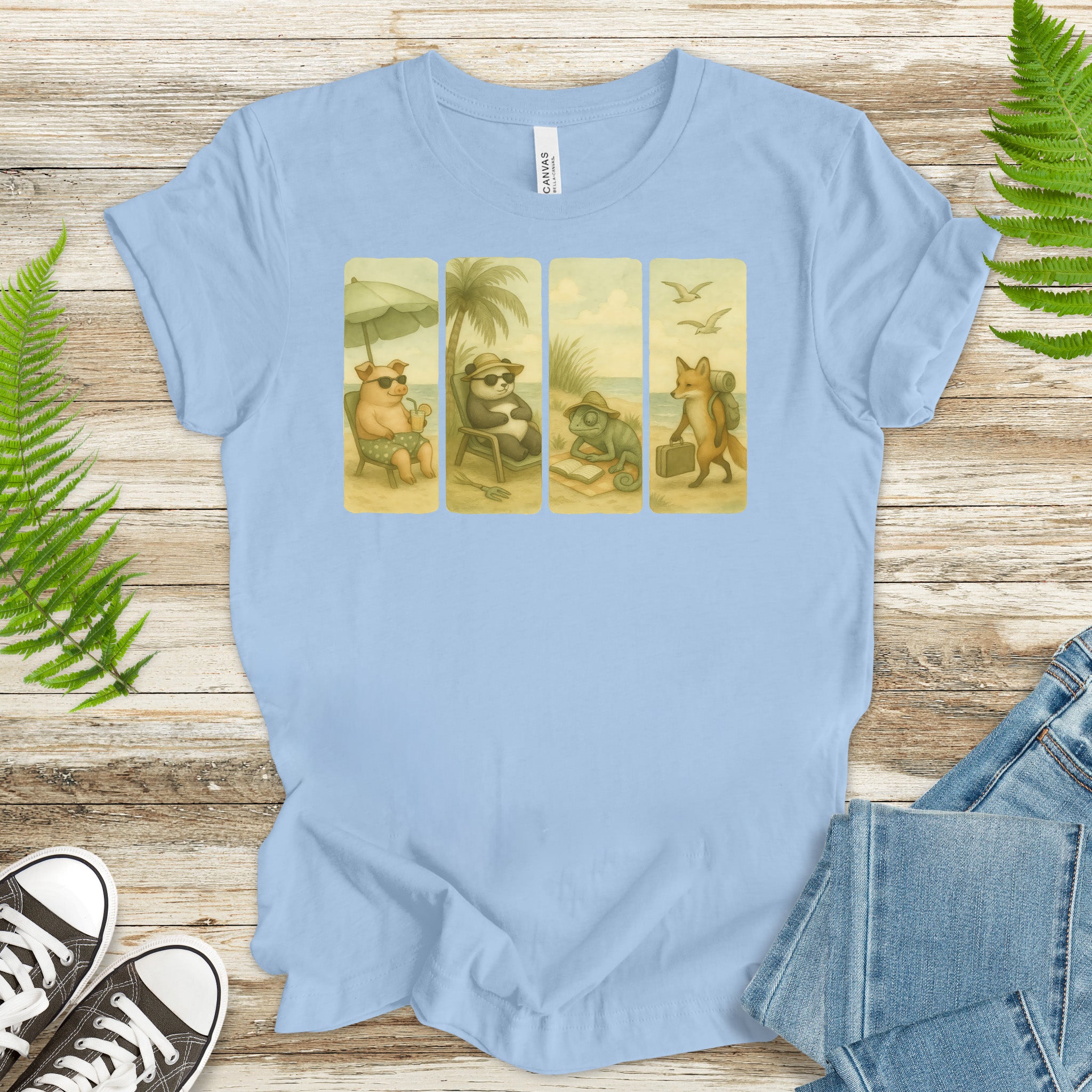 Beach Animal Strips T-Shirt – Cute Panda, Fox, Pig & Chameleon Vacation Tee