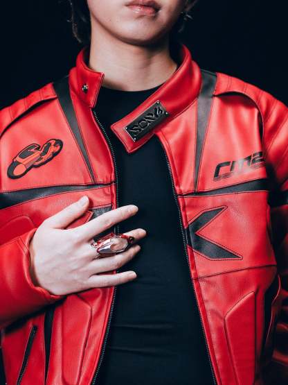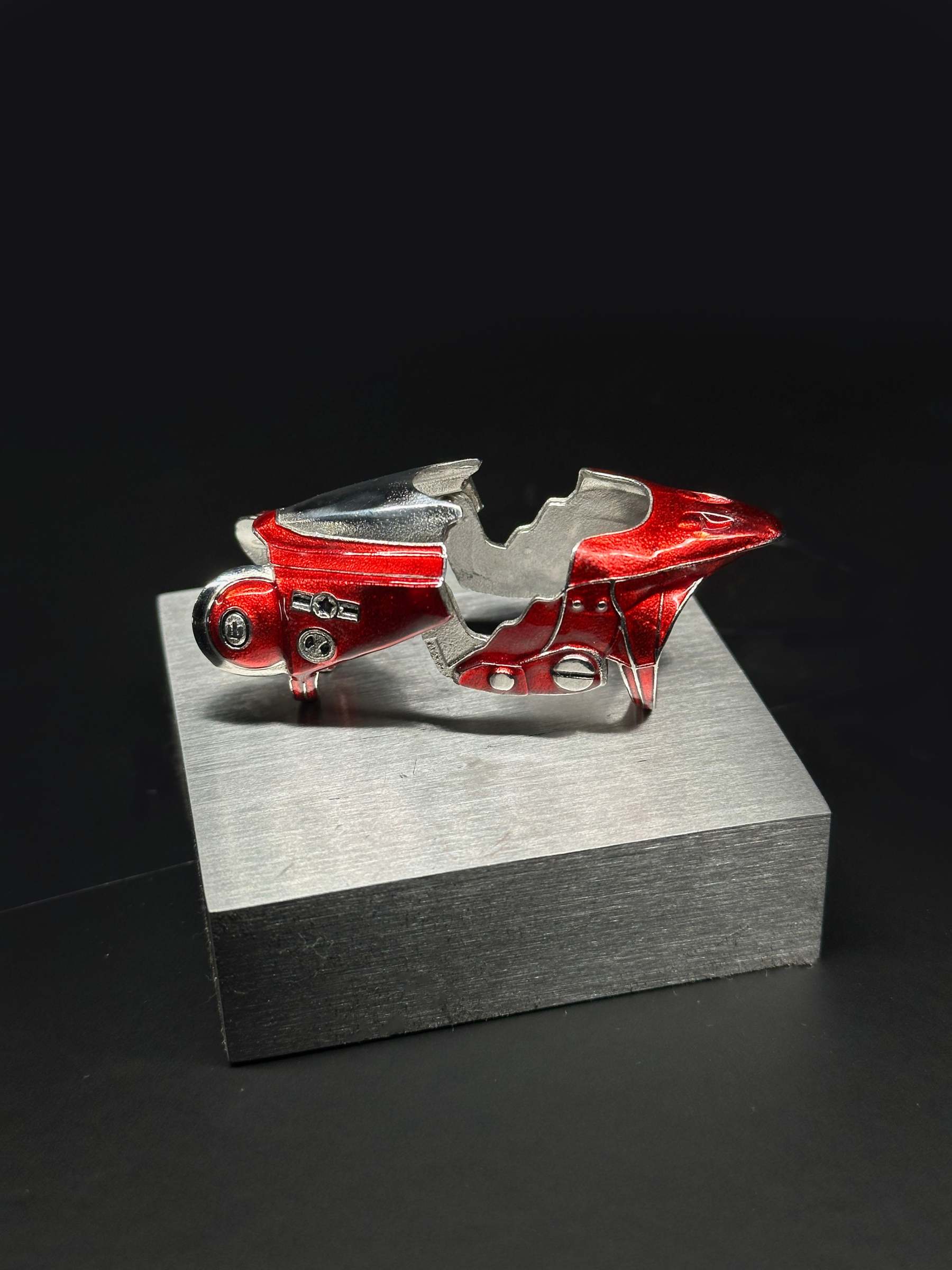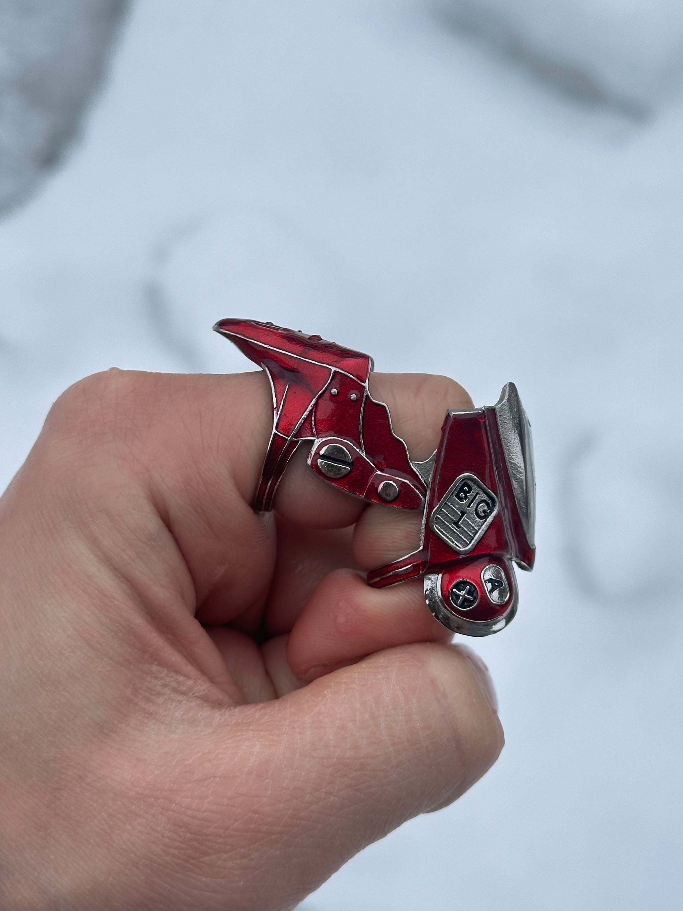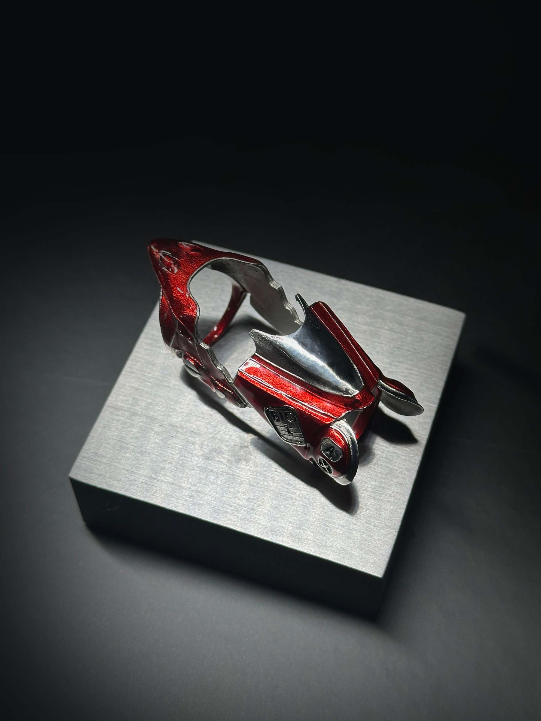 Made from solid 316L stainless steel, this ring features bold, hand-painted red enamel inspired by the iconic bike. Built with a smooth articulating hinge, the ring bends and flexes with your every move.