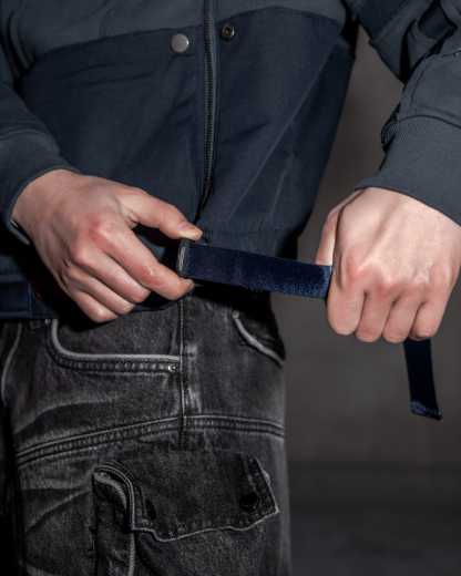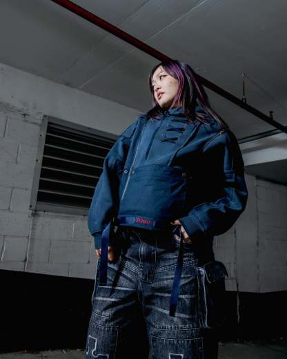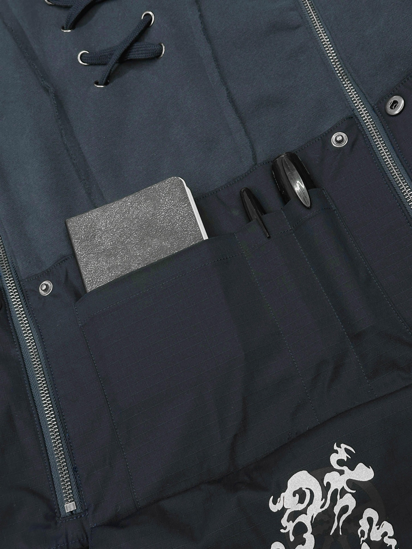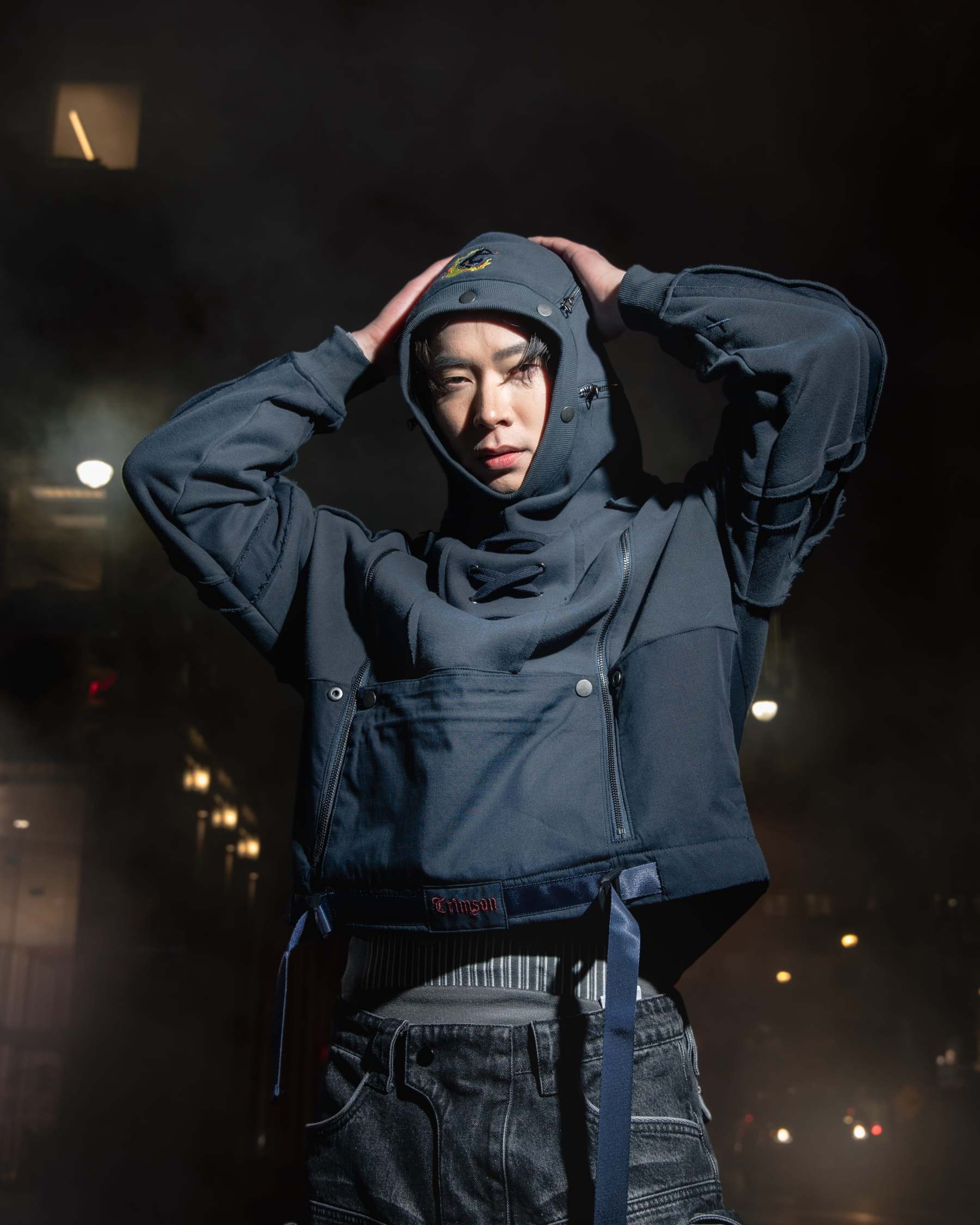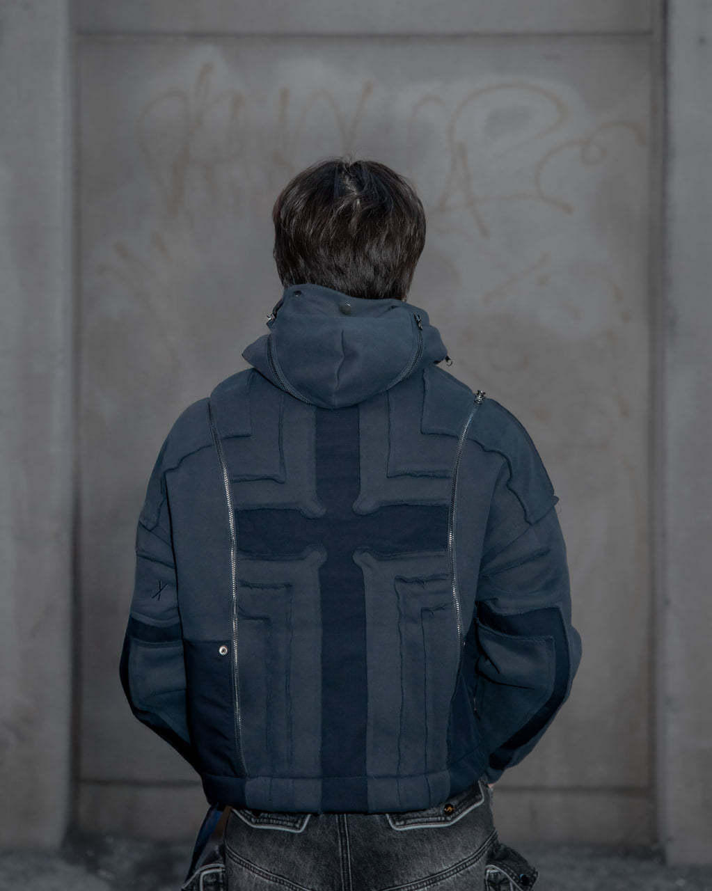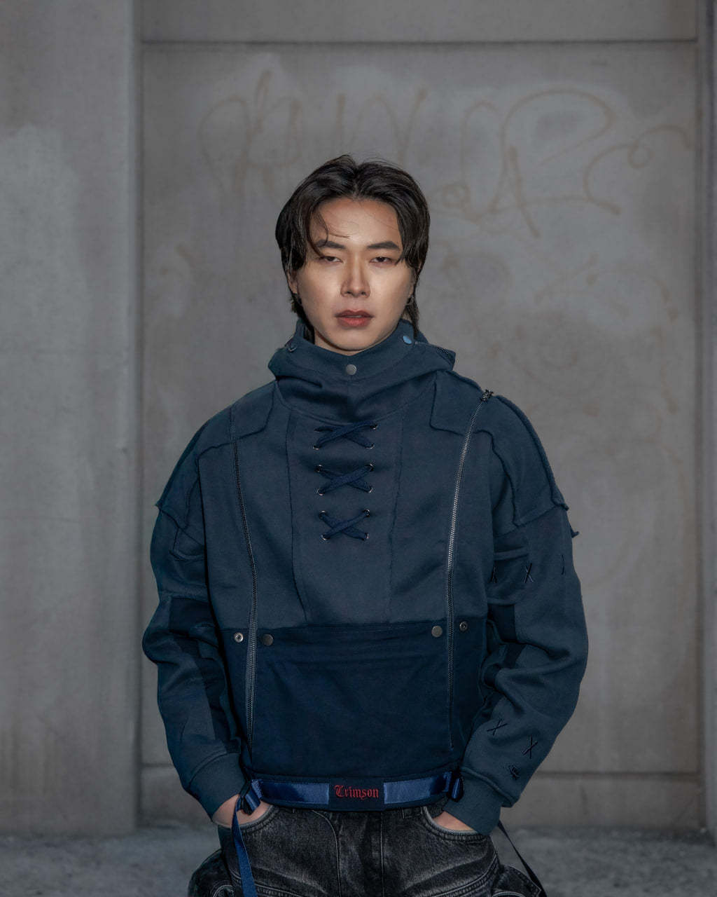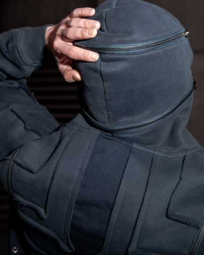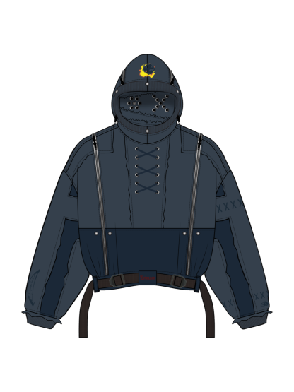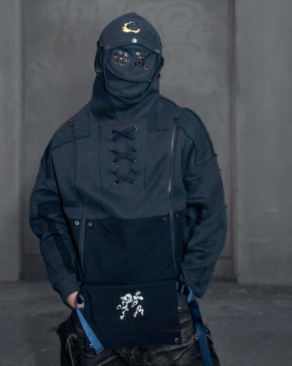 This hoodie is cut & sewn with mixed fabric textures (fleece + ripstop contrast) and raw-edged seams. Made from a 70% cotton / 30% polyester blend. Features a detachable face mask, chest lacing detail, and functional zippers on the hoodie and shoulders. Finished with a multi-layered front pocket, built-in belt, embroidery details, and a reflective print inside the kangaroo pocket.