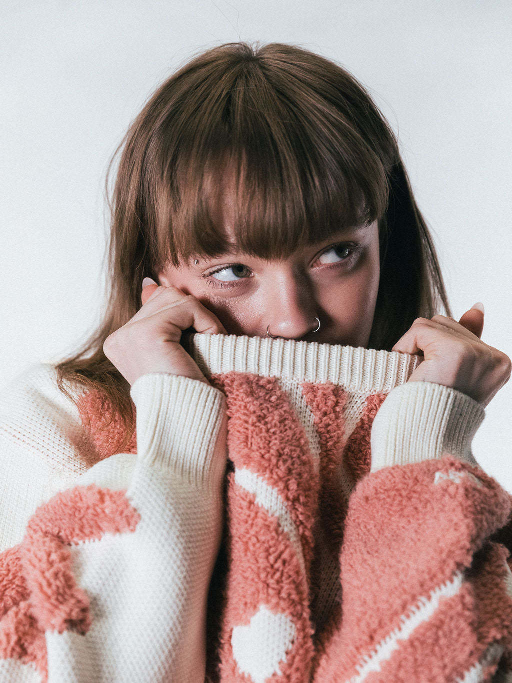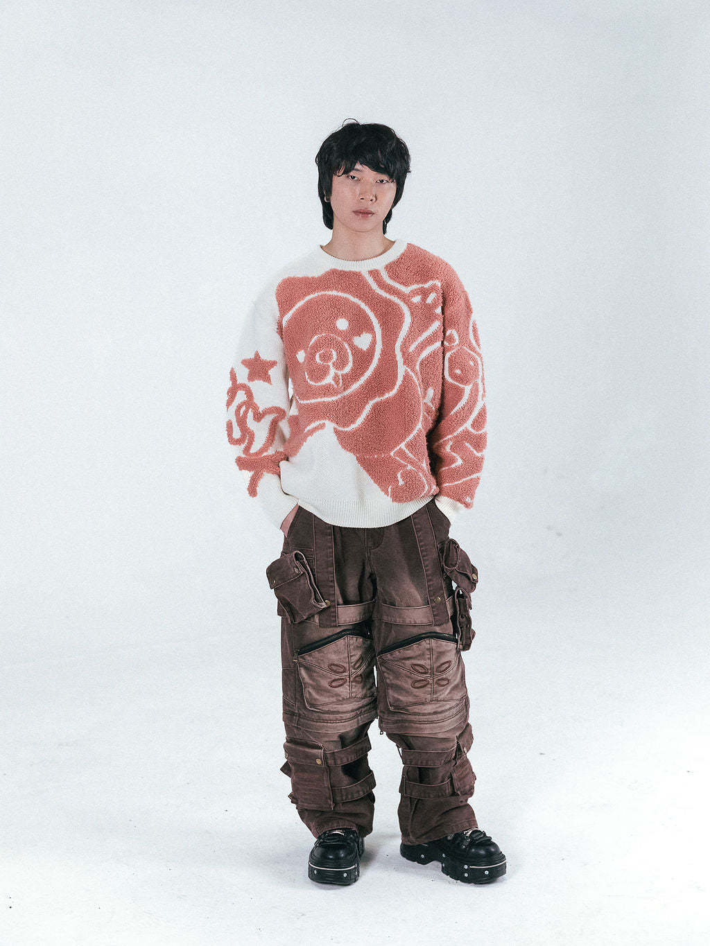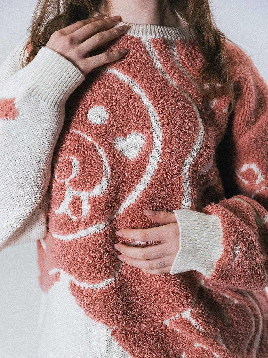 This knitted sweater is made from 100% soft cotton with a towel-texture knit for a comfortable, breathable feel. Features design elements on the front, back and sleeves.