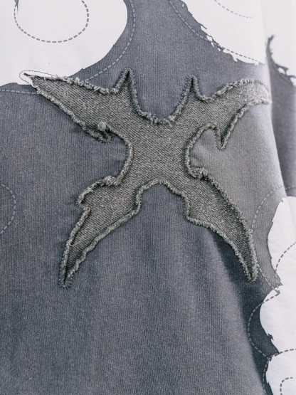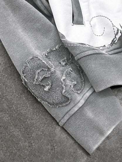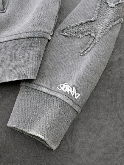 Raw-edged reverse appliqué cuts through the surface. An X-scar marks the chest, a simplified SUN GOD silhouette sits on the hood, and both sleeves carry the design outward. Details reveal themselves slowly with texture, shadow, and form changing depending on how close you look.