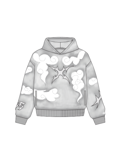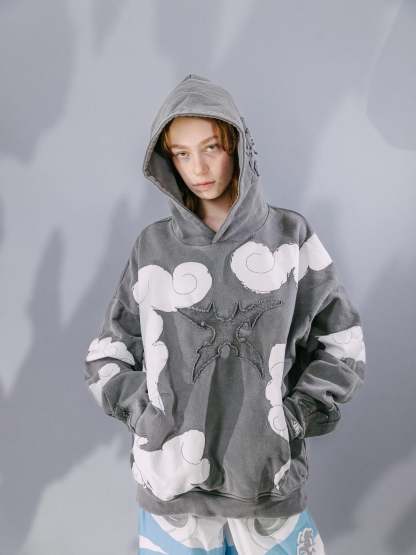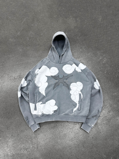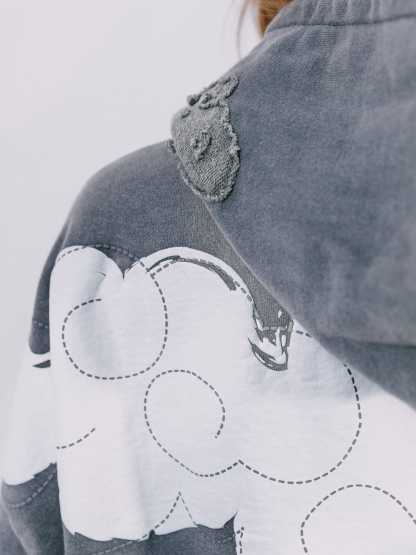 Heavyweight hoodie constructed from washed 100% cotton French terry, worn in and softened like it’s already lived a life. Layered graphics move across the piece through puff-printed clouds and printed stitching lines, creating depth that shifts with wear.