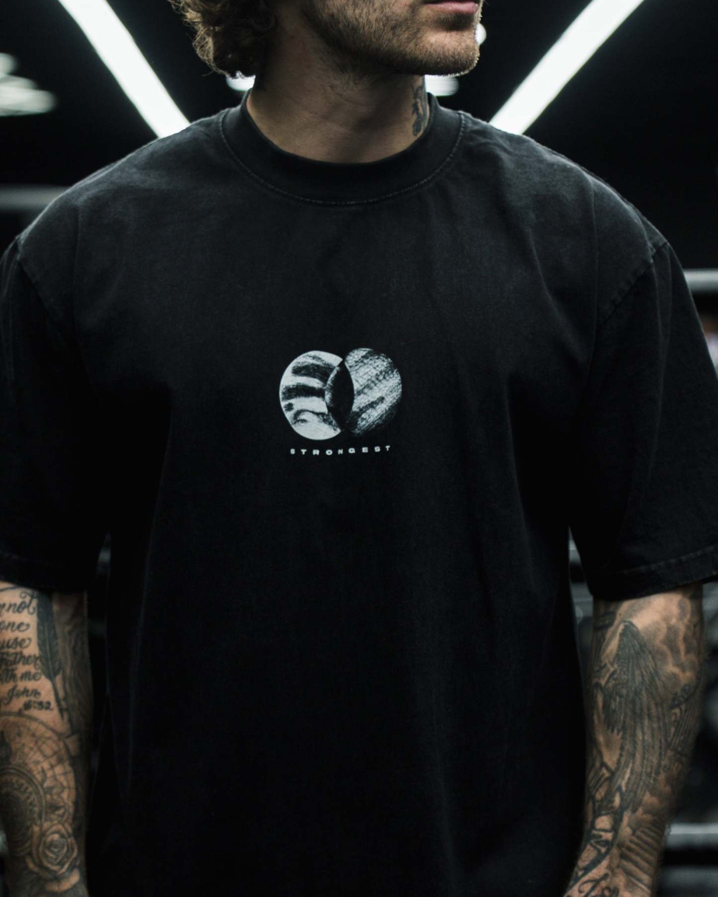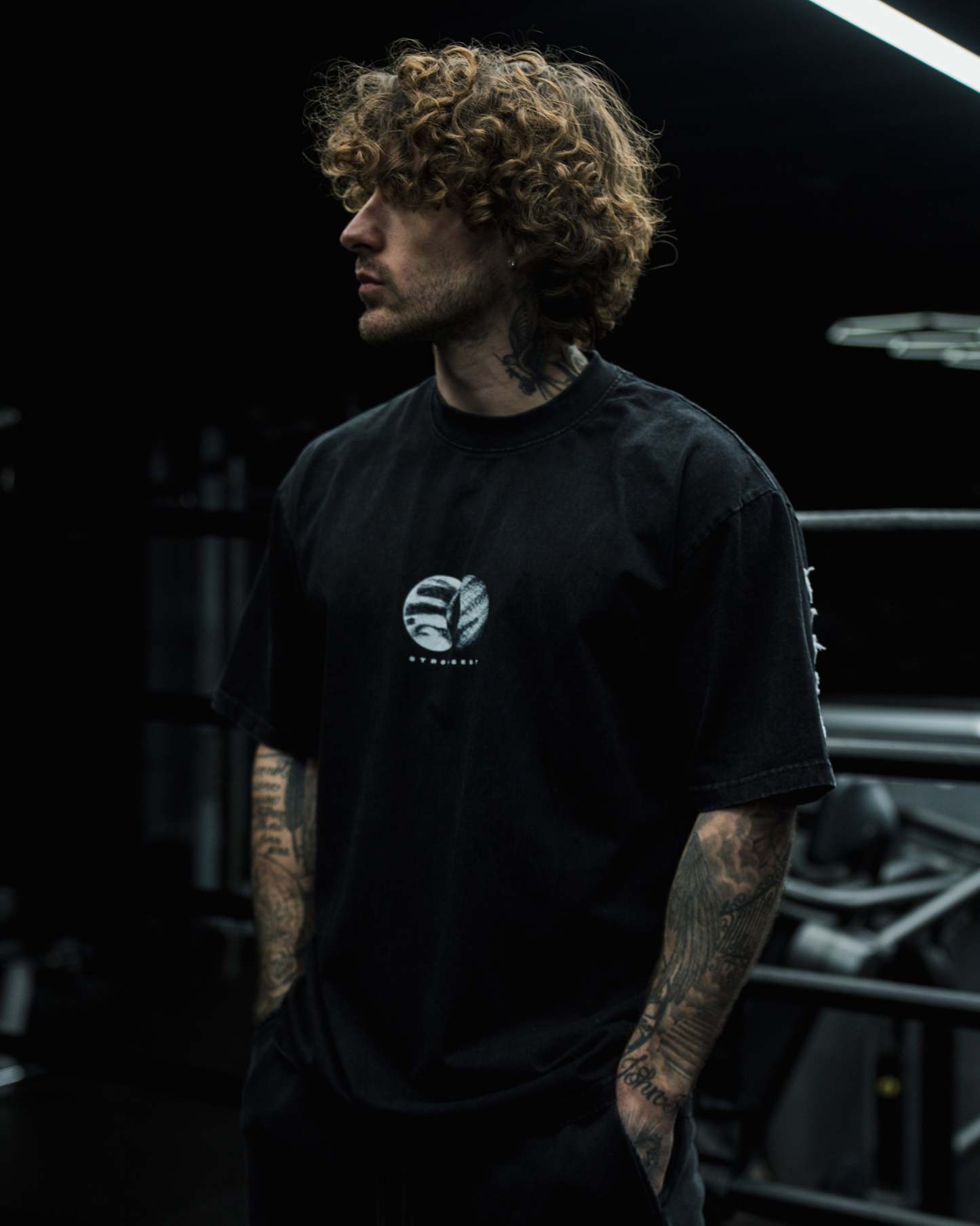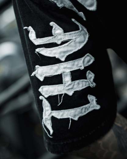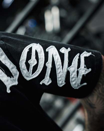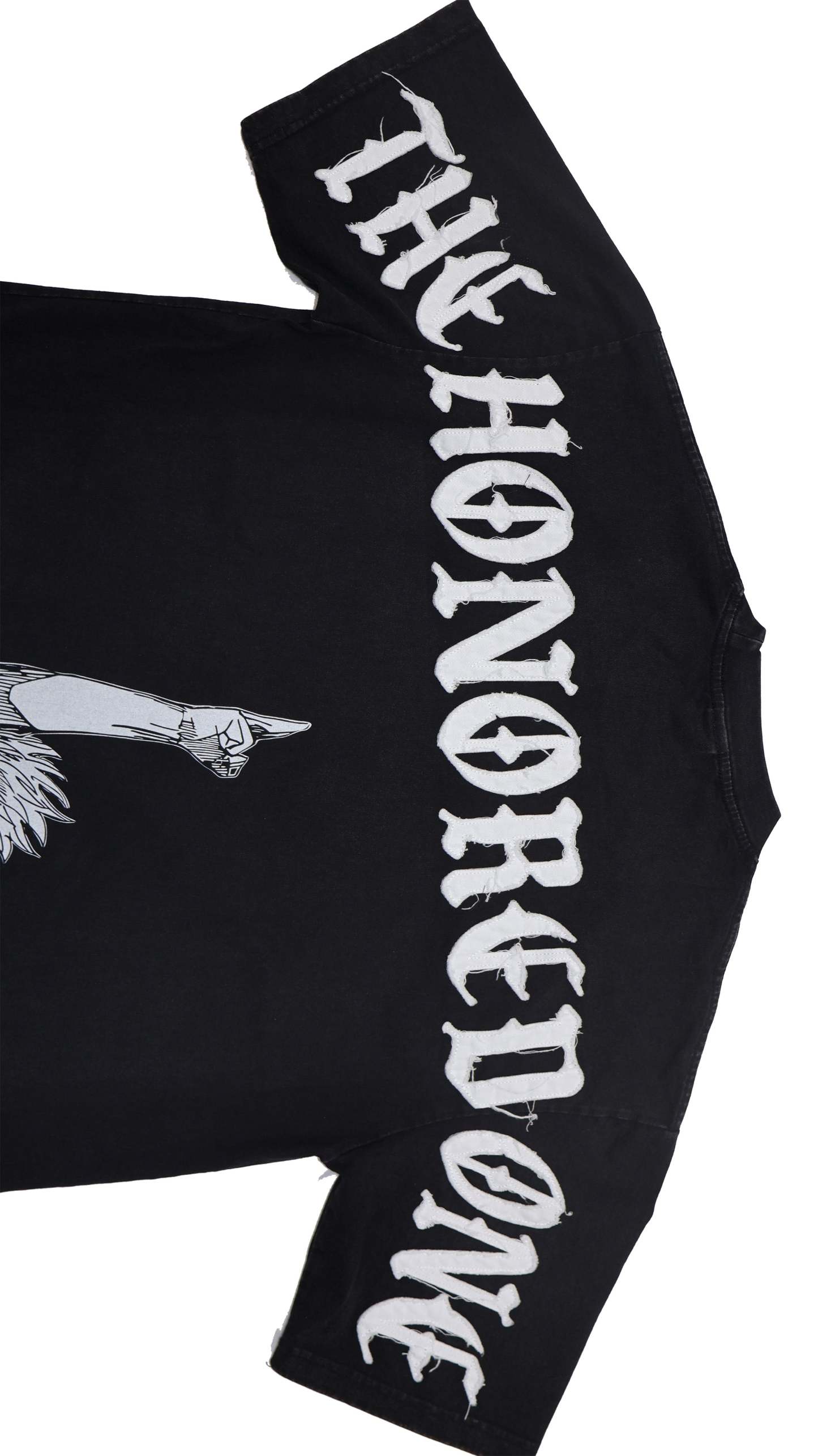 DESIGN: Direct-to-garment print on the front with a 14" distressed embroidery, and a direct-to-garment print on the back.